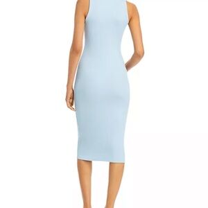 Sleek sleeveless sheath midi with a fitted silhouette. Soft pale blue knit fabric for comfortable stretch. Minimal neckline and clean lines for modern styling. Easy to dress up or down.
