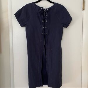 Features: short sleeves. Grommet Lace back detail. Crunch wash linen. Rounded neckline