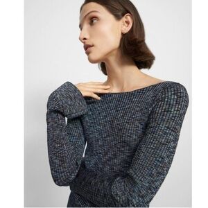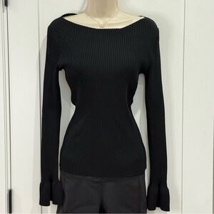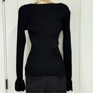 Theory Ribbed Black Boatneck Sweater Bell Sleeves Stretch Knit Medium Clean Girl