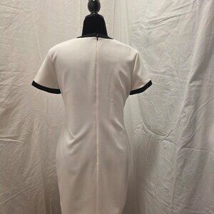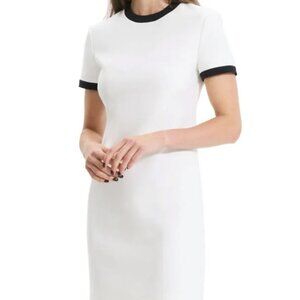 Elevate your minimalist style with this classic Theory sheath dress in a crisp ivory white with striking black trim along the sleeves and neckline. Designed with a flattering, tailored fit and a hidden back zip closure, this dress is perfect for both the office and evening outings. Size 12 with a structured yet comfortable feel. A timeless piece that pairs beautifully with heels or ankle boots.