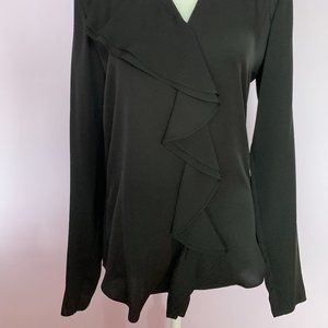 V neck ruffle blouse size small but runs more between small and medium due to sleeve length, longer in back for jeans, leggings etc.