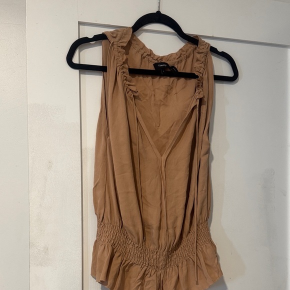 Elegant tan blouse with ruffle accents. Sleeveless design. Ideal for stylish outings.