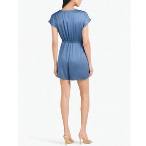 Theory Short-Sleeve Crushed Satin Wrap-Front Romper, Steel Blue