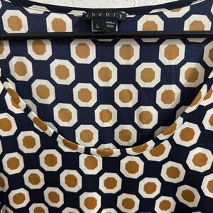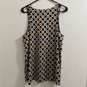 Silk/spandex blend navy blue, white, and gold tank top with a geometric pattern.