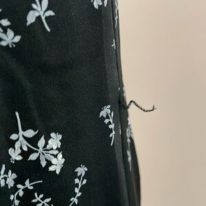 Black silk with silver and gray floral throughout. Pull over style. Partial hidden zipper in back.