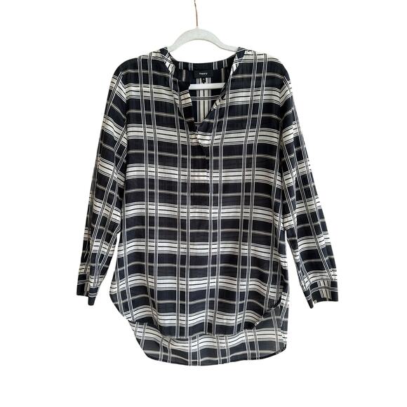 Theory Silk Tunic Blouse Sheer Black White Plaid Size Medium