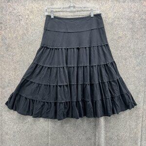 Item: Womens black tiered ruffle A-line midi skirt with a soft, flowy silhouette.