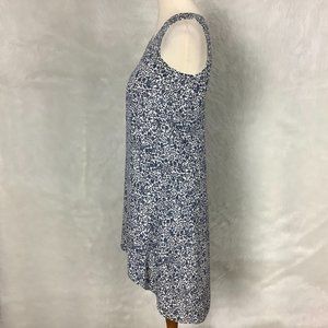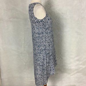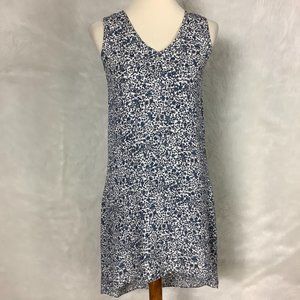 This is a sleeveless, blue and ivory floral print, hi-lo hem silk shift dress from Theory. V-neck, keyhole back. No flaws. Size 6 mannequin. 100% silk outer. 100% polyester lining. Spring, summer, wedding guest.