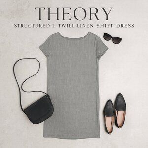 Theory dress, linen twill shift dress, structured shift dress, short sleeve midi dress, designer work dress, minimalist dress, fully lined dress, gray shift dress, professional dress, office to evening dress, spring dress, summer linen dress, fall transition dress, layer for winter, all-season wardrobe, travel friendly dress, linen blend, textured twill, midi length, capsleeve shift, quiet luxury, minimalist designer, designer resale, sustainable fabric trend