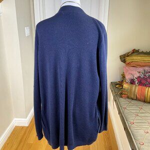 Beautiful high quality designer cardigan sweater, no close long sleeves with drape front, navy blue lightly ribbed knit, pockets