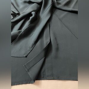 The most beautiful dress in a gorgeous deep jewel tone that is a mixture of blue and green. 100% silk. Has a wrap that ties in front. Flattering cut. I believe this would fit up to a size 2. Measurements are in images. Covered Button front.
