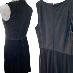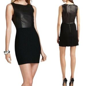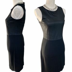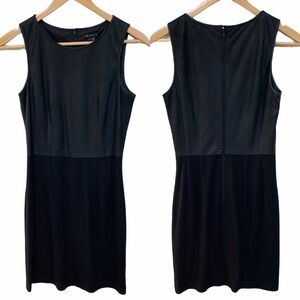 Black Tirionne CK Classical leather combo dress by Theory. Genuine goatskin leather bodice; stretch knit skirt. Sleeveless muscle tank top; exposed back zipper with hook and eye closure. In good used condition, pilling to knit fabric from regular use.