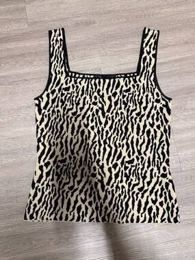 Sleeveless tank with a square neckline. Soft knit with bold animal-inspired print. Clean silhouette for layering or standalone wear. Modern, versatile piece for everyday outfits.