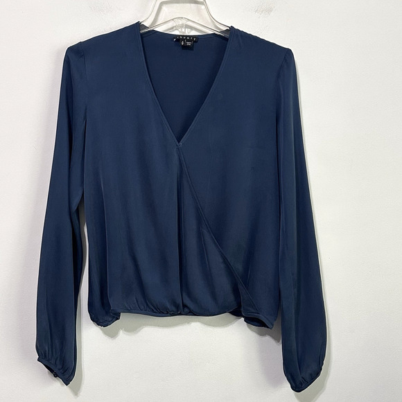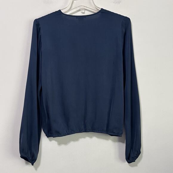 Theory Top Silk S Surplice Wrap Long Sleeve V Neck Blouson Work Party Blue Shirt