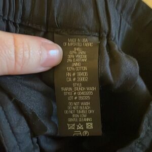 Features: linen blend, side pockets, drawstring waist, elastic waist, back faux welt pockets.