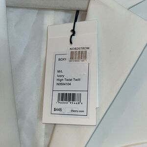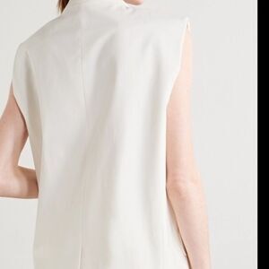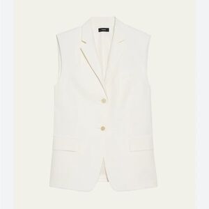 Crafted of cotton twill, Theory's sleeveless blazer is cut in an oversized, boxy shape. The classic design features notch lapels and side flap pockets. New without tags. The color is a creamy white.