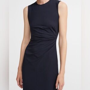 A super soft and classic sleeveless dress with a round neck and fun twisted detail in the front. Theory’s “smooth feather knit” fabric, so comfortable. Perfect simple navy blue dress that can be dressed up or down! Wear it on it’s own for spring or pair with a blazer got the office.