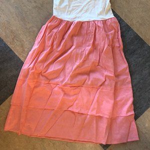 Cute and comfy summer dress -- dress it up or down! Stretchy linen in bright colors make it the perfect dress for brunch or for the beach. Hits just below the knee.
