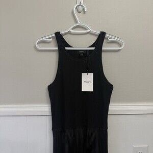 The Theory Vinessi Pleated Maxi Dress in black, size M, is a classic and elegant choice for various occasions such as weddings, parties, formal events, and business gatherings. This sleeveless dress features a pleated design and a zip closure, making it a stylish and sophisticated option for the summer, fall, and spring seasons. Made from a knit fabric, this A-line dress requires dry cleaning and is perfect for women looking for a timeless and versatile wardrobe piece.