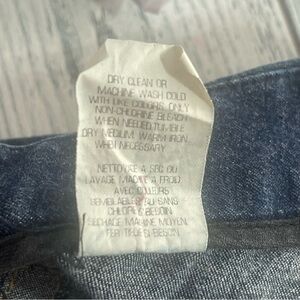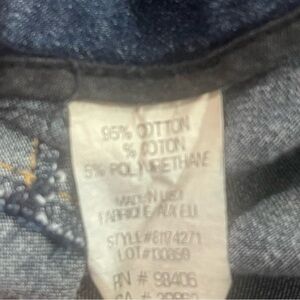 Dark wash denim, one small money pocket at waist, zipper/button and slide clasp closure, button is loose, there is a sticker on the inside from either store or dry cleaners, fading at back seam, no flaws (beside button)made in the USA,colors may vary due to lighting, good used condition, size 10