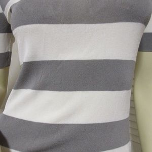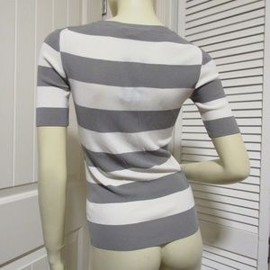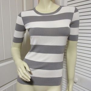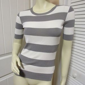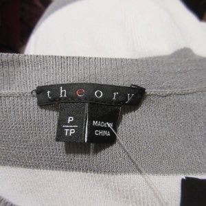 Theory women's short sleeve striped stretch bodycon knit top t-shirt tee blouse. 100% AUTHENTIC. Multicolor (white and gray/grey) striped pattern. Round neck. Short sleeve. Material is 92% Viscose 8% Polyester, stretchy fabric.