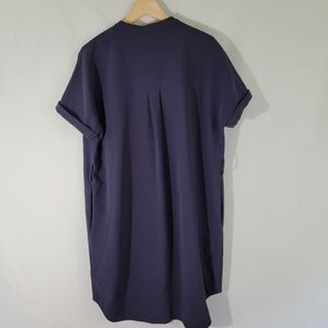 Theory Women Navy Shirt Dress Sz L Faux Silk Short Sleeve Midi Pocket High-Low