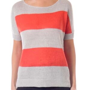 Chic crew neck sweater with bold red and gray stripes. Perfect for casual outings.