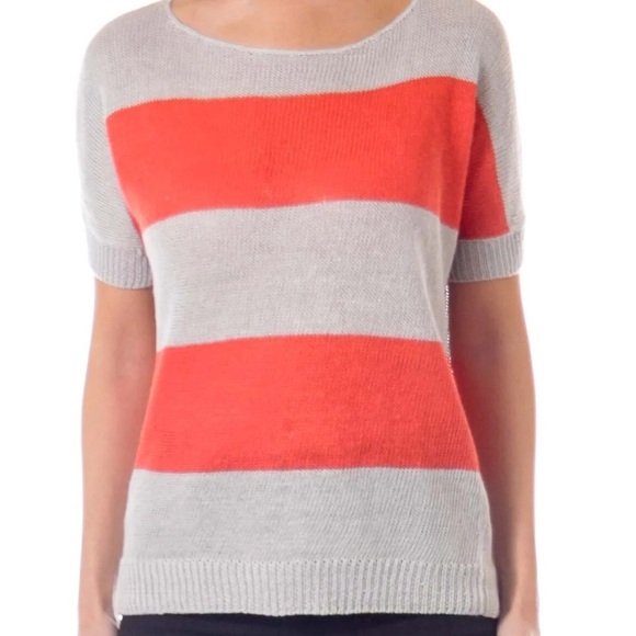 Chic crew neck sweater with bold red and gray stripes. Perfect for casual outings.