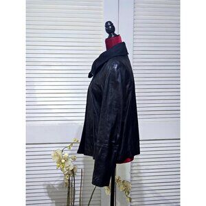 This exquisite Theory leather jacket, made in Italy, offers an elegant blend of sophistication and style, perfect for a variety of occasions. Crafted from supple leather, it features a chic double-breasted design with a stylish shawl collar. The medium fit is ideal for those seeking a tailored look, and the jacket's classic black hue ensures it pairs effortlessly with any ensemble.