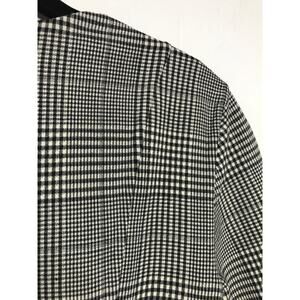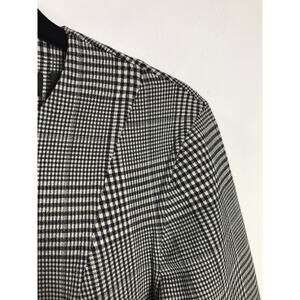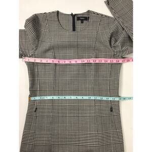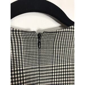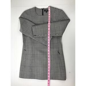 This dress is a structured, long-sleeve, plaid-patterned top in a black-and-white Glen plaid check (Prince of Wales check) print. It has a round neckline and a concealed back zipper, creating a clean and sophisticated look. The fabric appears to have a slight texture, suggesting it is made of a woven material suited for workwear or semi-formal occasions.