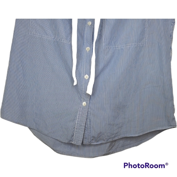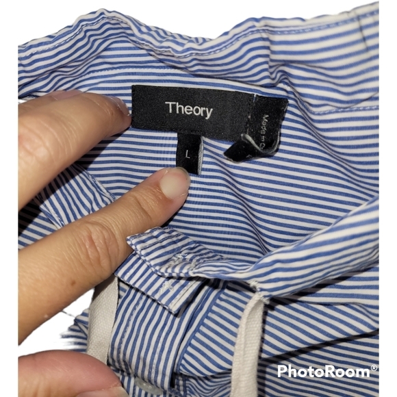 Theory Women's Large Blue White Micro Stripes Blouse Buttons Drawstring