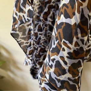 Flattering, flowy silhouette cut in luxurious silk chiffon fabric. This shirt has minimal detailing, allowing the pattern be the defining feature. Flat front, no pockets, long sleeves, classic collar. A dose of "urban sophistication" for your fresh but smart workwear.