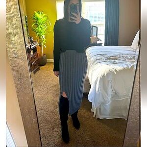 This Wool luxury sophisticated midi pencil skirt by Theory features a ribbed texture and a stylish slit, perfect for work or cocktail occasions.