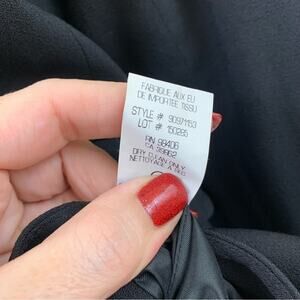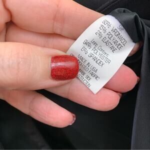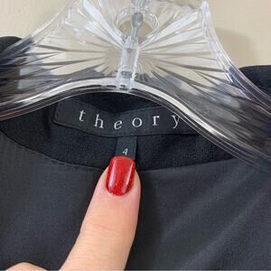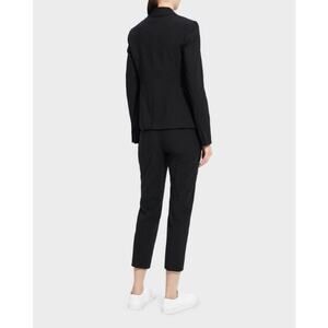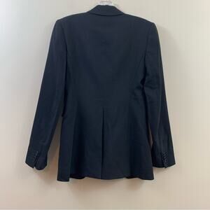 Size 4. 83% Virgin Wool 15% Polyamde 2% Elastane. Length 27 1/2 inches m. Armpit to armpit 18 inches m. Sleeve length 28 1/2 inches. Lined. The jacket is black lining and inside the cuffs is white/black striped lining. Slit is the back. Great condition!