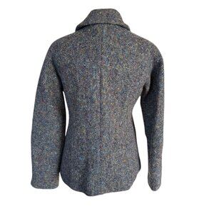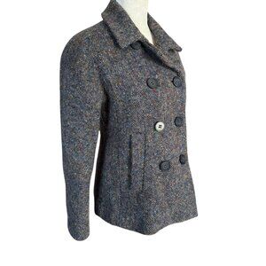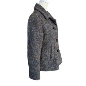 Women's Theory black/gray and multicolored woven wool long sleeve collared button down double breasted coat, size small. This has two front pockets. Excellent like new condition and from a smoke free pet free home. Quick shipper!