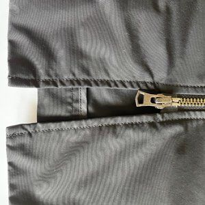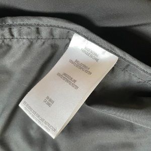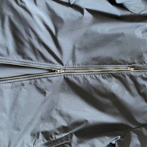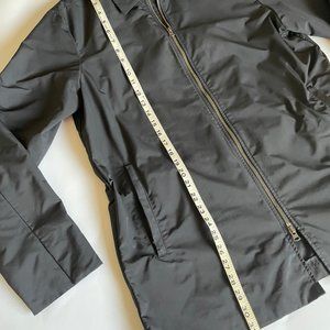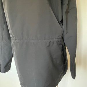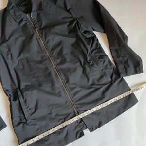 Theory 100% polyester zip front jacket with interior drawstring. Gently worn in very good condition. There is very slight wear on the collar tips and one small area at the bottom of the right pocket welt, otherwise the jacket is in like new condition. The drawstring on the inside of jacket has leather stoppers to adjust.