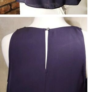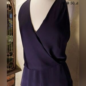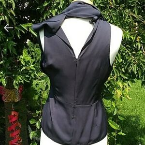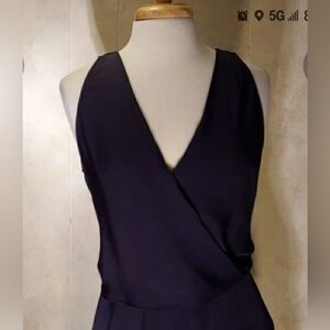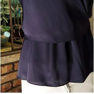 Navy blue v- neck sleeveless 100% silk. Perfect cond. Never worn. zip up back with over lay. Perfect for work, party, dinner date.