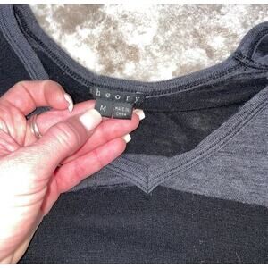 Theory brand lightweight long sleeve top in a stylish gray and black color combination. The top features unique side button details, adding a touch of sophistication to the design. Perfect for layering or wearing on its own, this top is a versatile addition to any wardrobe. It's in great condition and ready for a new home!