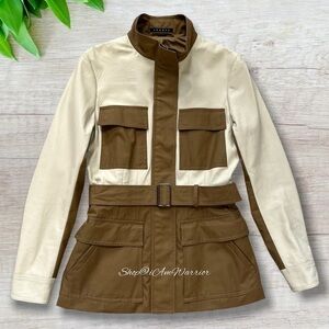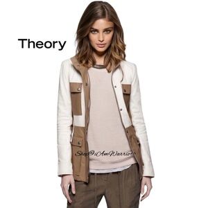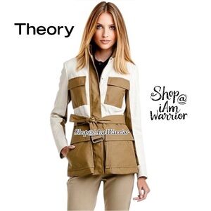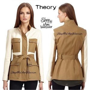 Perfect jacket for transitioning into Falll is this gorgeous Theory coated canvas and lambskin panels, utilitarian-chic jacket, stand collar and optional tie belt. The main front pockets offer handy dual entry. Front zip closure with outer snap placket. Snap-flap patch pockets. Fully lined. Color: Bone/Dark Oak. EUC, retailed at $795, generously priced at $100 off!