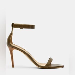 This high heel sandal is designed with two straps, silver hardware, and covered buckle. Made of soft Italian lamb leather with a grainy texture, this sandal has a leather cushioned insole for a comfortable fit.