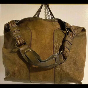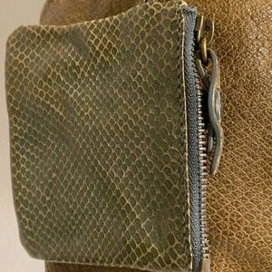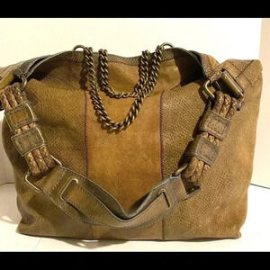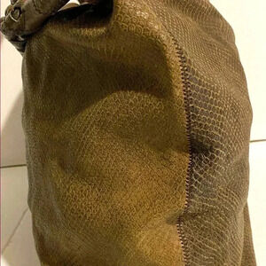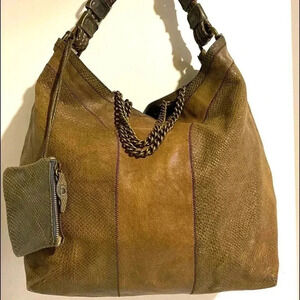 Authentic Theory brown beige green distressed leather hobo / shoulder handbag with brass hardware main compartment 1 zip pocket closure at interior wall beige fabric lining lining have some stains pouch at side exterior have marks stains please check all photos Strap drop 5” shoulder strap 13” Bag dimensions are based on approximate measurements. Before placing an order please take a moment to view all photos using zoom feature for a closer look