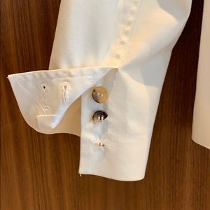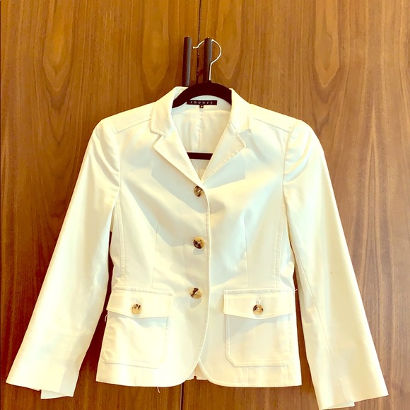 Classic off-white Theory jacket — fully lined — flattering, slim fitting silhouette — a great wardrobe staple — broken buttons on one sleeve as pictured (easily replaceable)