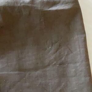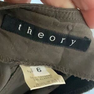Theory light brown linen blend pant. Smooth waist top for no bulk. Side zip. Wide Leg. There is a very small pull in the back up near the waist (please see pic) which would be easily covered by a sweater or blouse. Price reflects flaw.