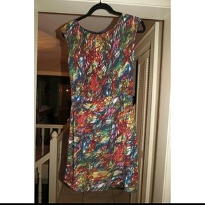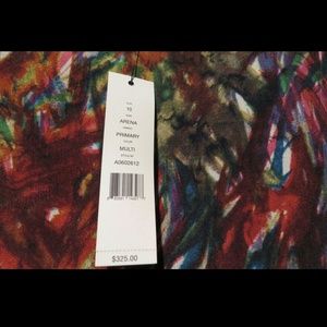 Wide neck, print silk dress with elastic banding at the waist. 100% silk. 33" long from shoulder. Brand new, with tags