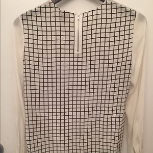 Semi-sheer, cream colored silk blouse with solid black grid-print patches over the breast. (So you can wear without a bra for an edgier look.) Grid also appears on the back. Looks great tucked into a skirt or slacks. Received as a gift and only wore once because crew necks aren't the best cut for me, but it's a nice blouse and I'm considering keeping it, so will probably keep the price up.