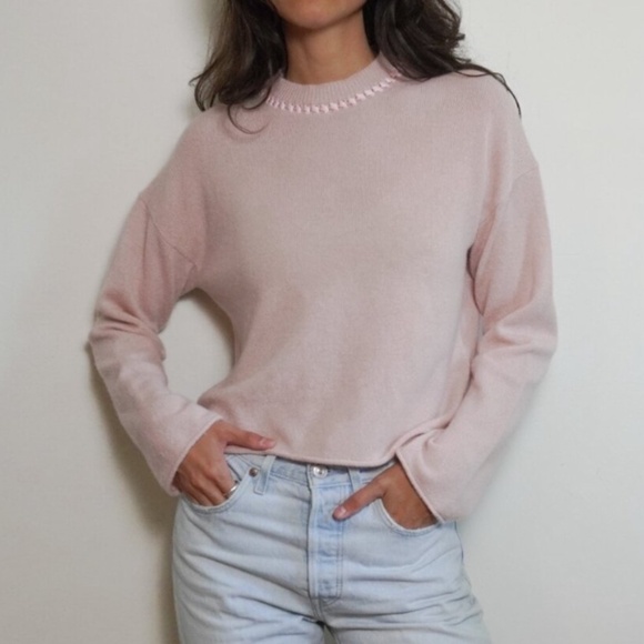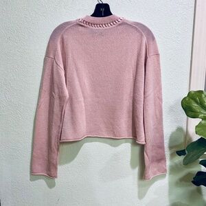 Super soft Theory Ribbon Trim Cropped Cashmere sweater worn once Smoke-free home pictures looks different colors because of the lighting. The right color is a light pink.