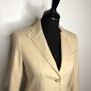 Theory tan button front blazer. Collared with double button front. Double front pockets. Slightly padded shoulder. Button cuff sleeves. Back slit hemline. Fully lined. Size 8. Excellent preowned condition. Some spots on inside lining.