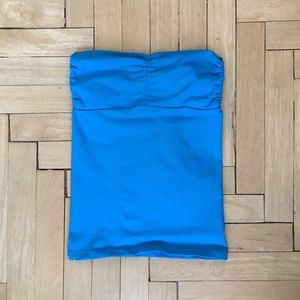 Theory turquoise tube top with halter straps. Ranching in front, sides and back. One size. 92% nylon, 8% elastane.