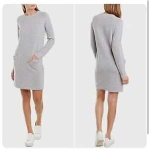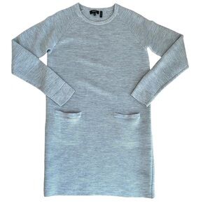 Theory women’s Noble crew grey wool blend long sleeve ribbed sweater dress. 95% wool 5% polyester. Light gray color. Ribbed design. Thick material. Style is called Noble crew long sleeve sweater dress. Excellent condition. Women’s size medium. Measures approximately 18 inches flat across chest from armpit to armpit and 35 inches in length.