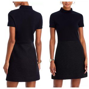 DESCRIPTION: Pre-layered for a refined one-and-done combination, our short-sleeved dress is detailed with a rolled neck shell in a Milano stitched merino wool knit for a second-skin fit. Zipped along the side, this mini style is tailored with a flared skirt that is constructed with modern blended wool tweed created by a leading Italian mill.